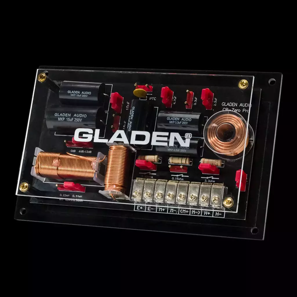 El sistema de altavoces incluye un crossover pasivo (no disponible en la versión activa AC). El sistema completo de altavoces Gladen Zero Pro está diseñado y fabricado en Alemania.